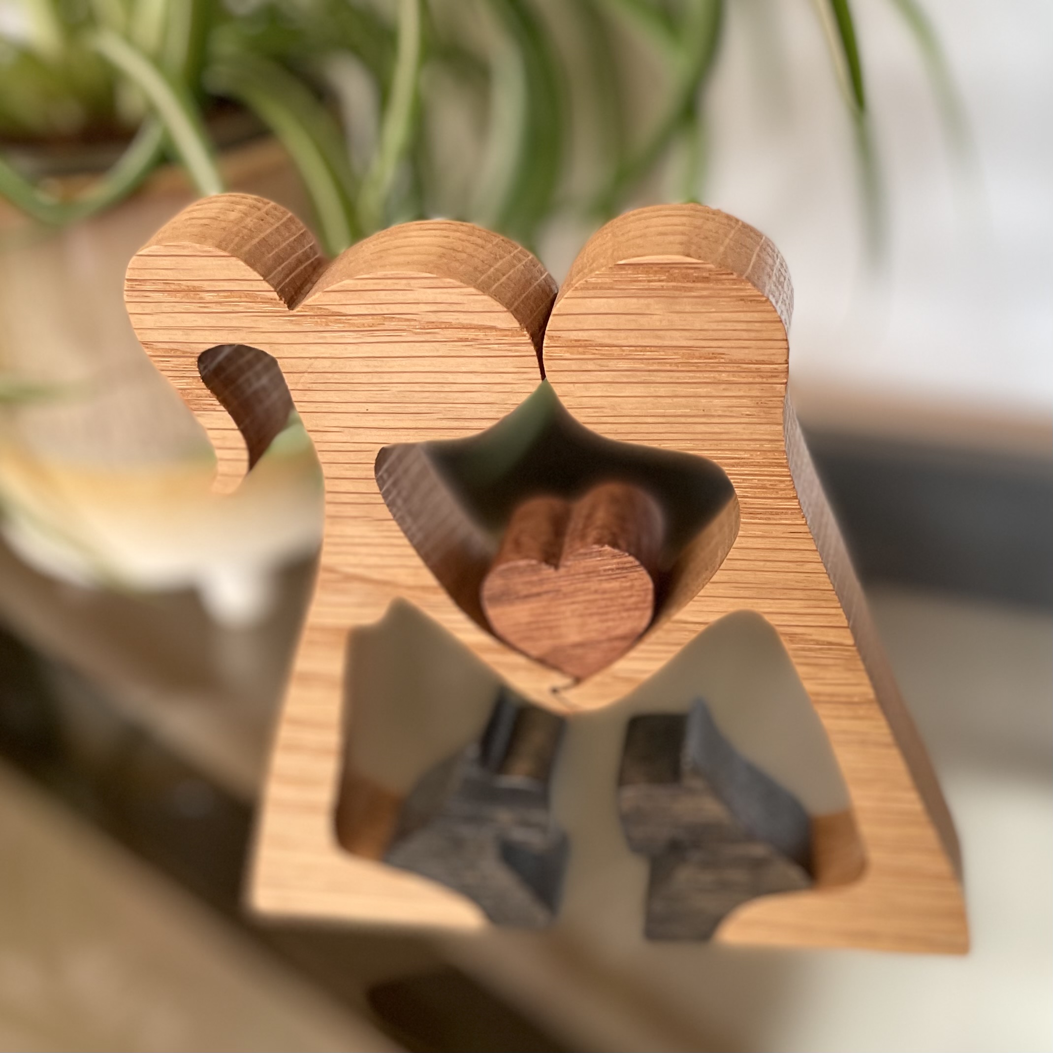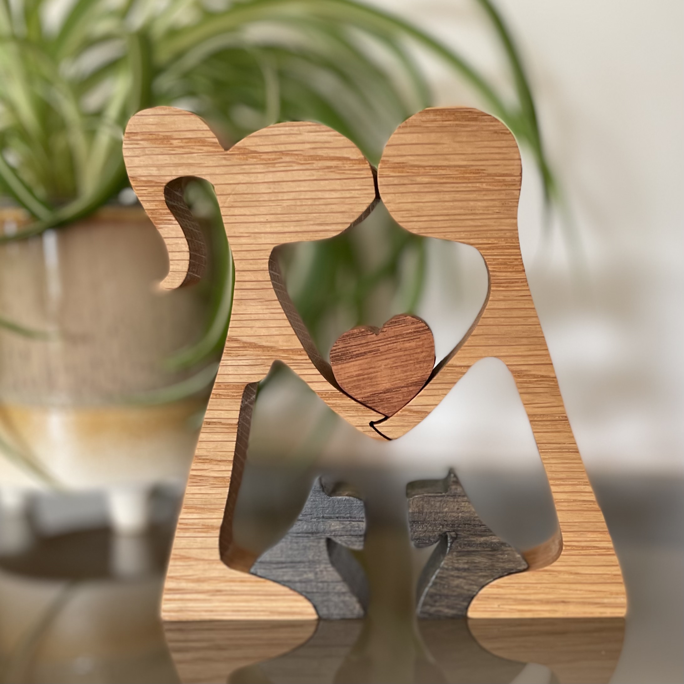 “All You Need is Love and a Scottie Dog”! Celebrate love and companionship with this beautifully handcrafted wooden sculpture. Made from high-quality oak, this unique piece features a stylized couple leaning toward each other, their heads forming a heart shape that frames a smaller wooden heart — a timeless symbol of affection and connection.