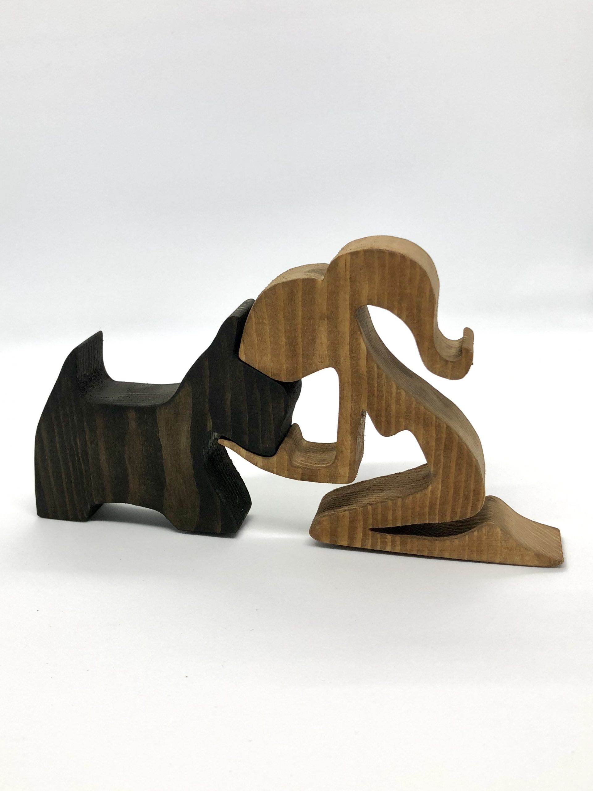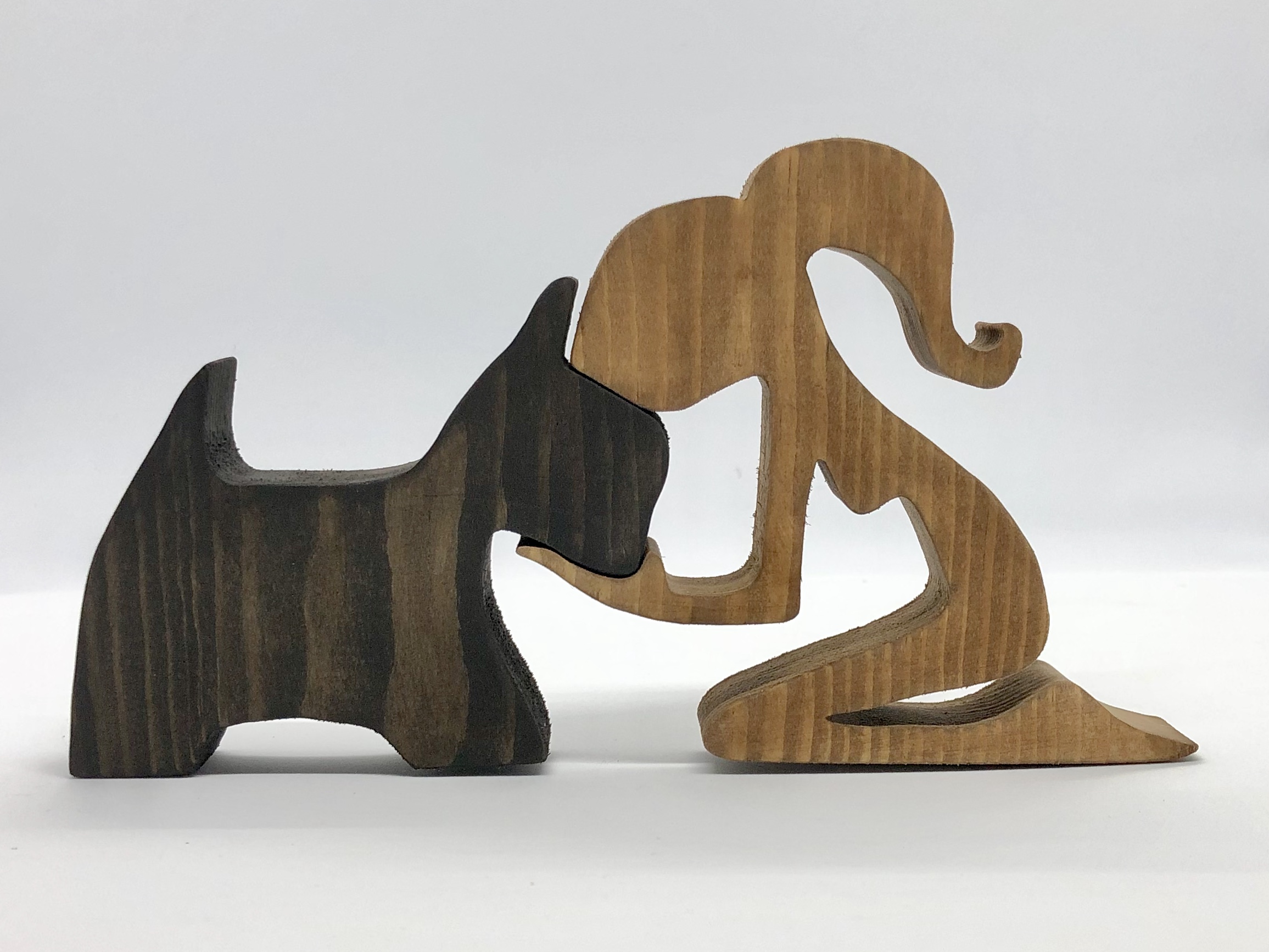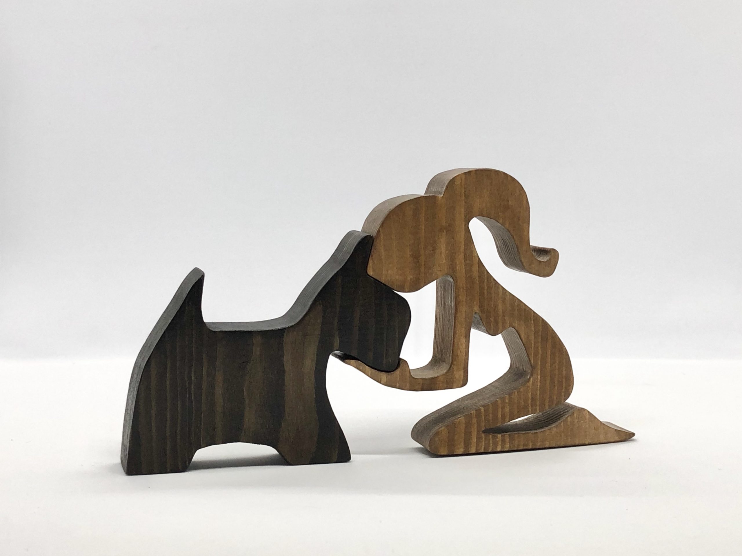 Handcrafted from natural wood, the piece features two interlocking figures — a young girl and her Scotty — designed to fit together in perfect harmony. The girl, carved in light oak, kneels gracefully with one hand gently resting on the dog’s face. The Scotty, sculpted from darker wood, stands calmly, embodying loyalty and trust.